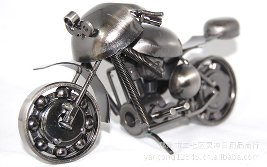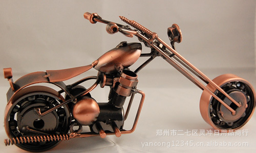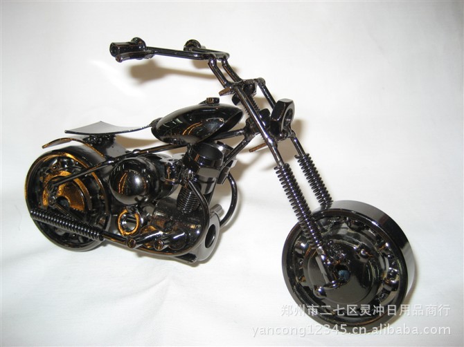所有产品都是手工制作。电镀烤漆。是馈赠朋友之佳品公路赛015哈勒016太子011摩托车。手工制作。设计独特。22cm011.12.13.16.18.保质期20年 郑州市二七区灵冲日用商行前身是郑州市金鑫铁艺厂成立于九八年九月,是一家专业从事铁艺礼品设计、生产及销售的综合性私营独资企业。公司从创立到现在因其厂家直销价格低的优势、贴心的服务以及过硬的质量一直受到广大批发商、零售商、淘宝网、拍拍网代理商等的大力支持与信赖。公司拥有完整、科学的质量管理体系.凭诚信、实力和产品质量获得业界的认可。 我们公司生产的老爷车系列产品(包括汽车,火车,消防车、吉普车、摩托车、飞机,加油器等),全部工艺均用铁皮为材料仿真制作,从零件加工到组装、上色,全部由手工完成,细节丰富,配合仿古的喷绘效果,有很高的观赏和收藏价值,适合家居装饰、业余收藏和礼品赠送。目前已经推出的款式已经达到近千种,仍不断开发新的产品,也可根据用户的要求进行个性定制。 经过多年的发展,凭着良好的信用、优良的服务与众多厂家建立了长期的合作关系。热诚欢迎各界朋友前来参观、考察、洽谈业务。.