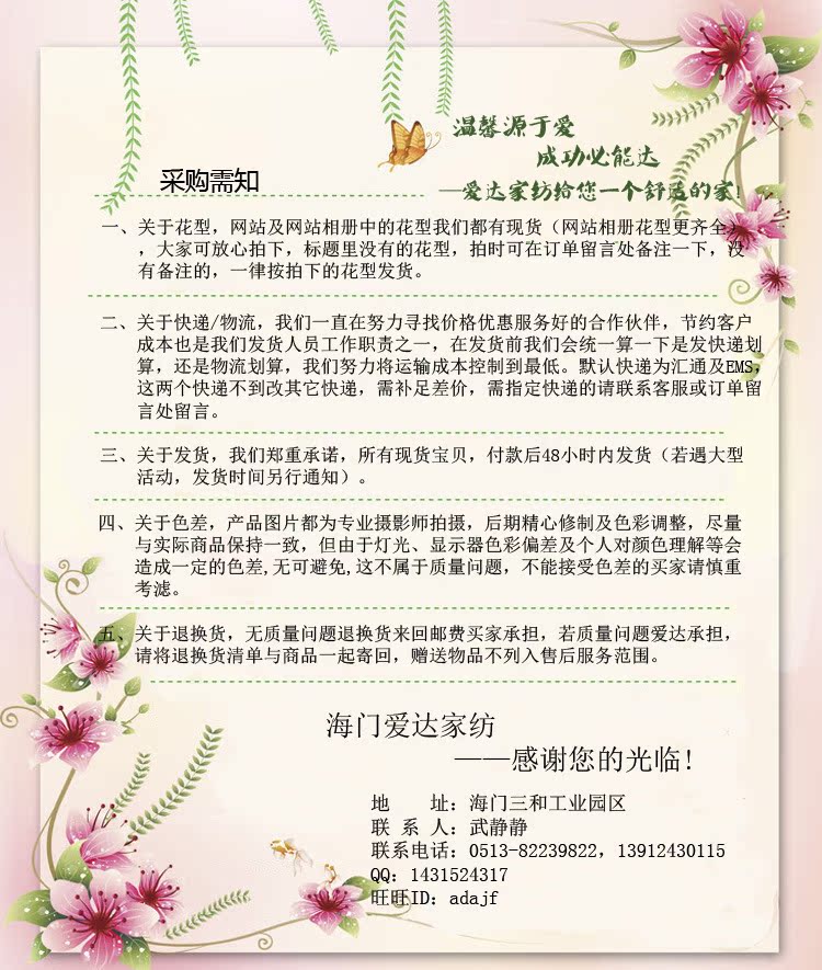 海门爱达家纺专注于中高档床上用品的研发、制造与销售,依附于世界第三大家纺产业基地——南通国际家纺城的产业链,及时掌握家纺行业动态,紧随时尚潮流,让您的床品永远走在时尚的前端。 爱达家纺的产品主要有套件、被子、枕芯、盖毯、床垫及夏令用品,爱达家纺以“打造家的温馨与时尚”为理念,立志为客户提供简约、舒适、健康的床品。我们秉承“质量第一,诚实守信”的宗旨,以热情的服务满足客户需求。多年来爱达家纺以优异的质量,合理的价格,热情的服务赢得了广大客户的一致认可。 面对未来的机遇和挑战,我们追求更高品质的产品与服务,不断开拓、勇于创新。爱达家纺将用感恩的心回馈广大客户对我们的关爱。温馨源于爱 成功必能达——爱达家纺给您一个更舒适的家!