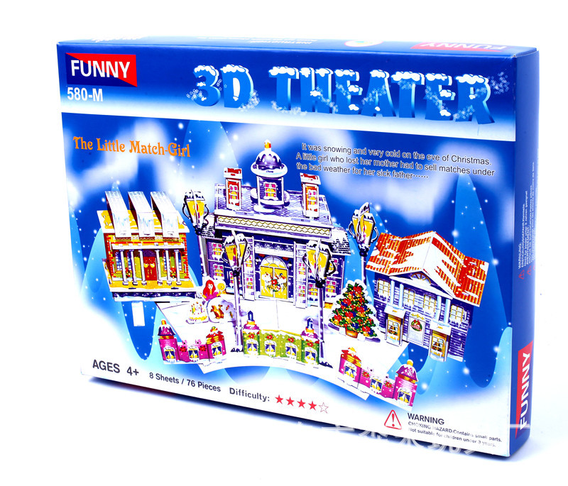 此系列立体拼图取材于童话故事,对孩子有极强的吸引力。材料不同于一般的纸制,木质和塑料的拼图,每一片由三层结构裱合而成,正反两面是五色印刷的纸张,均由德国海德堡五色机一次印成,图案精美,色彩艳丽,中间是一层特殊密度的泡沫板,轻巧硬挺,拼装完成后整体结构紧密合理,造型逼真,非常有立体感。