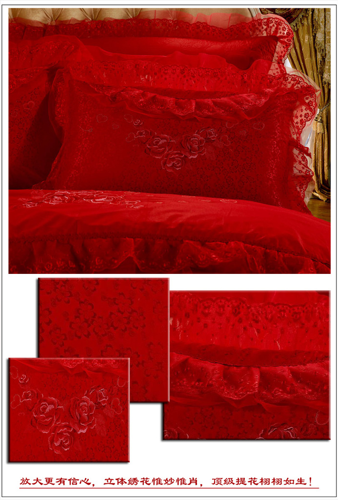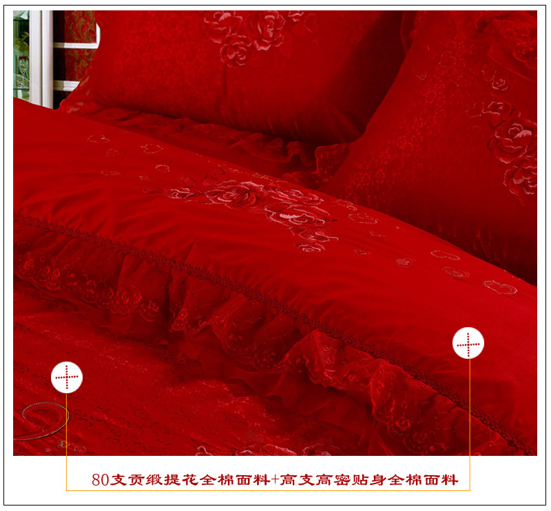 本款婚庆7件套采用高支高密贡缎精梳全棉,手感柔软、质地细腻,优雅大气的绣花搭配绝美的蕾丝花边设计堪称完美,奢华大气婚庆床品。