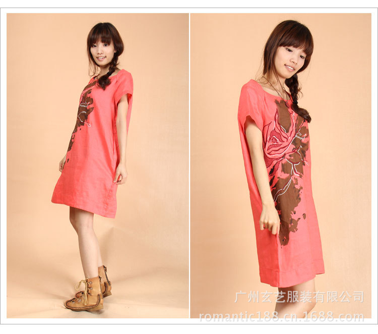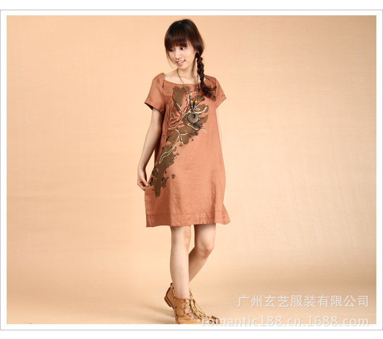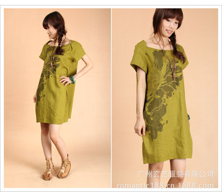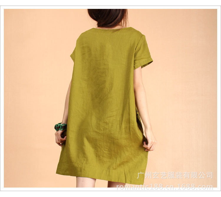 玄艺亚麻刺绣连衣裙批发大码女装连衣裙刺绣裙黄色连衣裙原创品牌