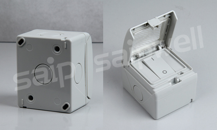 saipwell/赛普品牌SP-1GS 单路防水开关,防水开关有插座,主要用于潮湿的地方,如别墅门口,做为门铃开关,或者卫生间灯的开关等。开关外面有一层防水保护透明盖。分为单路和双路。单路:是指按下开关即是通电,松开后就弹回来了;双路:是指按上去打开,按下来是关闭,与正常的墙壁开关一样。安全触摸尤为重要,可通过透明膜片直接进行操作,确保接触安全。框架可在紧固固定螺丝前安装在底座上,盖板夹紧可靠、维修方便,确保正闭时防护等级为IP55。