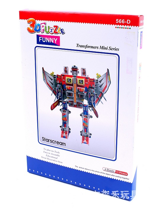 2011年五月与北京某出版社合作的图书赠品(共有12款) 变形金刚玩具是每个男孩子都迷恋的一种玩具。每个小男孩的内心深处,都有一个人和伟大的擎天柱相似,那个人浑身充满了力量和正义,他是地球上最强壮的人,也希望自己长大后能成为一个无比强大的顶天立地的男子汉!这个系列的立体拼图不仅是一种集娱乐学习欣赏于一体的DIY动手玩具,纸质材料,无毒无害,拼装的实物造型逼真,生动形象。可以锻炼小朋友们动手动脑的能力,还能极大地满足他们内心深处的梦想。