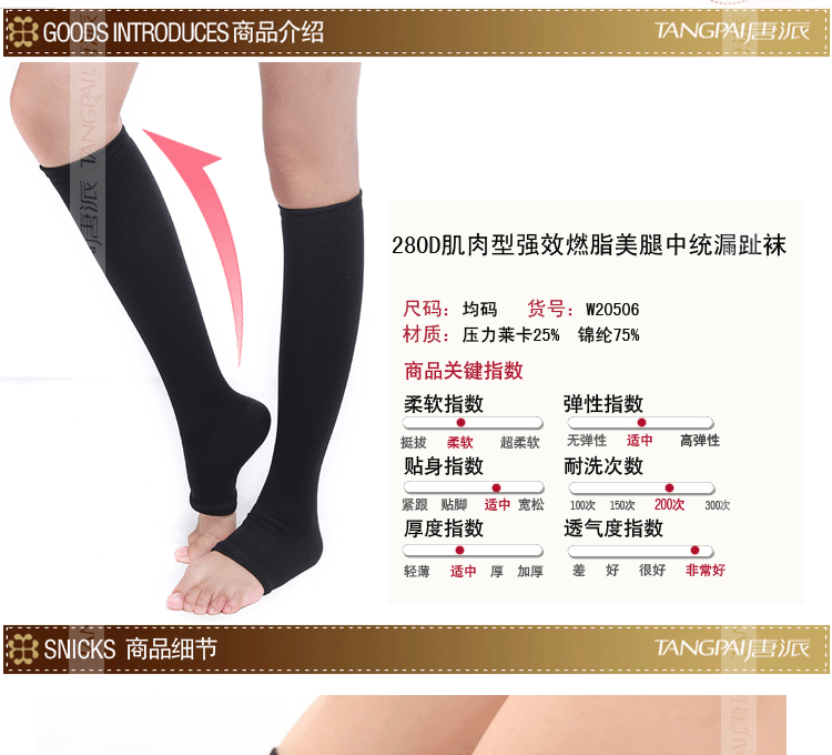 唐派W21506瘦腿漏趾袜套 280D弹力塑型瘦腿漏趾袜 批发瘦小腿袜