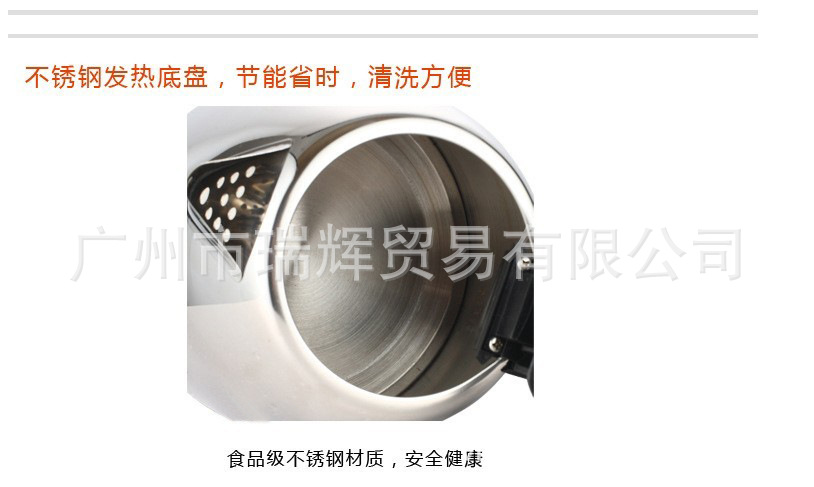 本系列电热水壶,理性化设计,为您的生活带来方便和快乐;享受快速烧水,节时省电蒸汽感应控制器,水开后自动断电,干烧保护断电,采用优质温控器,360度旋转底座,高品质不锈钢外壳,外观高贵大方,100%沸水,有效杀灭细菌,身体更健康。