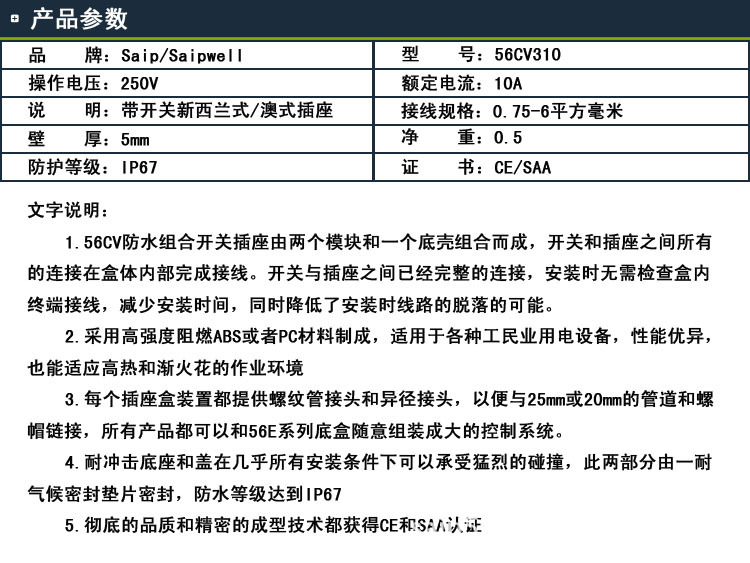 赛普集团已引进国外资深管理与经验丰富的专业人事,以严谨的管理有创意的研发团队,先进的营销直念,在传统产品的基础上创造和发展了新的更适用的且具有良好性价等的产品.Saip产品已获得CE、ROHS、、EMC、VDE、UL等国内国际认证.产品已得到机关行业的认证认可,并远销东南亚、中东、东欧及美州等地域.