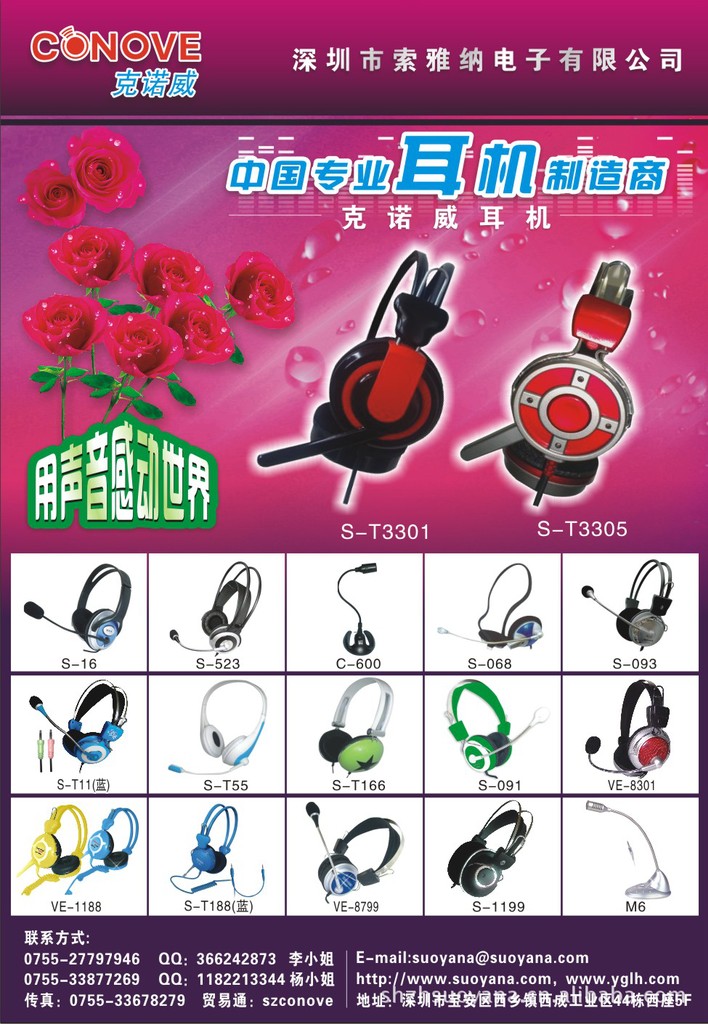 本厂专业生产电脑耳机,麦克风,为给广大客户提供及时方便的服务本厂产品均现货供货和OEM定单生产。现啊里巴巴网上推出我们的形象产品,索雅纳和克诺威系列产品,结合10年的市场销售,我们形成了一整套公司管理及产品信息,方便行业人士提供批发和OEN定单,用最少资金拿最好的产品。批发价格区间:5-120元左右,大到零售为10元-320元,主生产产品:电脑耳机,电脑麦克风,MP3耳机,USB耳机,手机耳机,无线耳机,键盘 鼠标几大系列多种品类,本产品全场支付宝担保交易货款俩安全。 我們的宗旨是追求産品質量卓越,信奉顧客至上的商業道德;嚴守精誠協作的商業原則.
