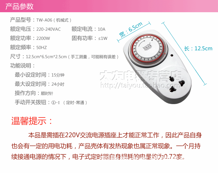 型号:TW-A06,最小定时设置时间为15分钟。