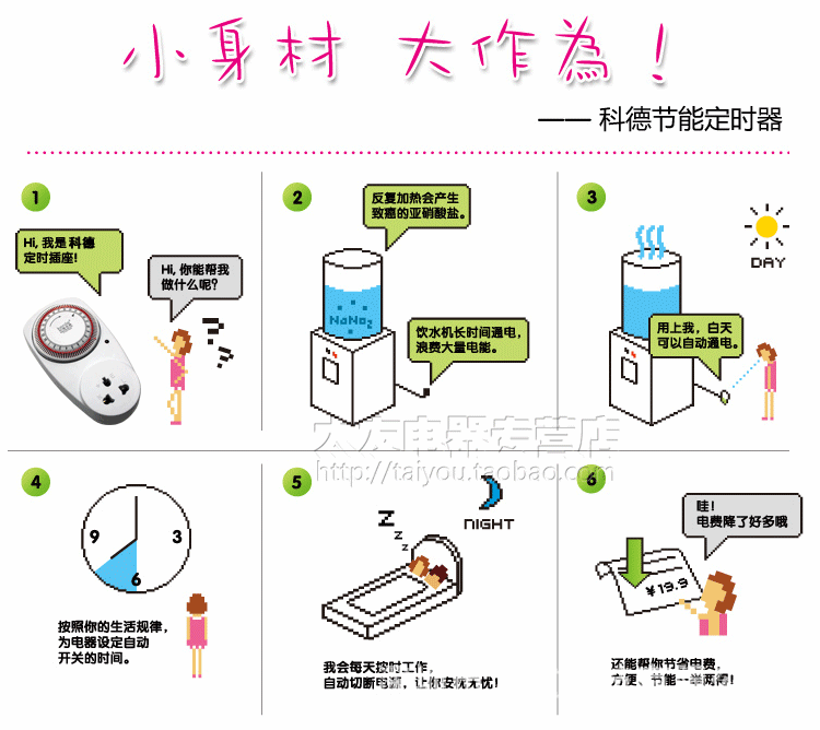 出门逛街,8:30回家,精疲力尽,真不想开锅做饭,可是,饭还得吃......矛盾怎么解决?微电脑定时开关解决方案:出门前淘好米,洗好菜,定好18:00时开始通电煮饭,回到家便有饭吃。