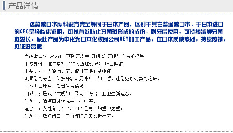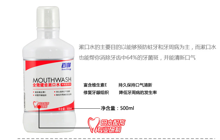 以往人们认为早晚刷牙就可达到卫生标准了,可就口腔卫生新理念来讲却远远不够。专家提出:清洁口腔像洗手一样必需。但随时随地拿出牙膏、牙刷却又不现实,漱口水这时便可挺身而出,担当重担,随时随处它都可以为你清洁口腔,拒绝残渣对牙齿的侵蚀;再者,在一些场合进餐,含有葱、蒜等味重的美食,使你“欲罢不能”,但不是没有办法,备一小瓶漱口水,只需去趟洗手间,马上口齿清新,了无痕迹,让您尽可大饱口福;其次,旅行途中,水箱缺水或用水拥挤都是常有的,备瓶漱口水,一切烦恼一漱了之;另外,漱口水还将是牙齿脱落的老人、不会刷牙的孩子以及不能忍受刷牙的牙病患者口腔卫生保障的最佳选择。