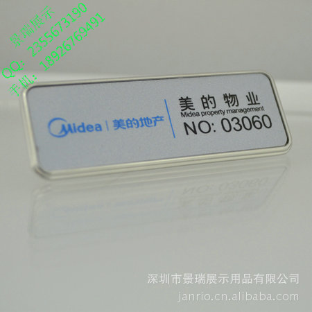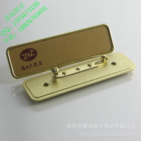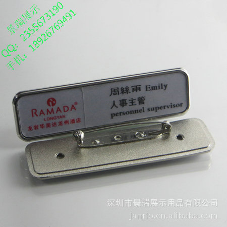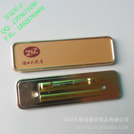 我公司自设工厂,自有品牌,胸牌系列产品齐全,货期稳定,交货及时,代发快递! 锌合金胸牌产品适用中高端国际连锁酒店以及高端品牌公司,如希尔顿酒店(HILTON HOTEL)、洲际(Intercontinental), 皇冠(Crowne Plaza), 假日(Holiday Inn)、快捷(Express by Holiday Inn)、万豪(Marriott Hotels & Resorts), J.W万豪(JW Marriott Hotels & Resorts)、凯宾斯基酒店(Kempinski Hotel)、喜来登(Sheraton)、威斯汀(Westin)、W 酒店(W Hotels)、香格里拉酒店、凯悦(Hyatt Regency)、君悦(Grand Hyatt)等等 欢迎各省市同行、印刷厂、广告公司、文具公司、图文公司、装潢设计公司、酒店用品公司、软件公司、电脑公司、打字社、礼品公司、外贸公司、印刷设计公司、淘宝网店代理来图来样定做,更多款式和报价请咨询在线客服,索取样板盒及样品画册。 可开具正规机打发票,需要开票请联系在线客服!----------------------------------------------------------------产品描述:型号: J032材质: 优质锌合金规格: 60*20mm & 70*20mm (其它尺寸和形状可自定)佩戴:别针或磁铁佩戴:5天包装:独立opp袋+外纸箱工艺:真空离子电镀,丝印或激光镭射LOGO、姓名、职位、编号----------------------------------------------------------------联系方式:手 机:18925209196电话:0755-89675492 0755-36631213办公版商务QQQ Q 1:2355673191 Q Q 5:2355673201