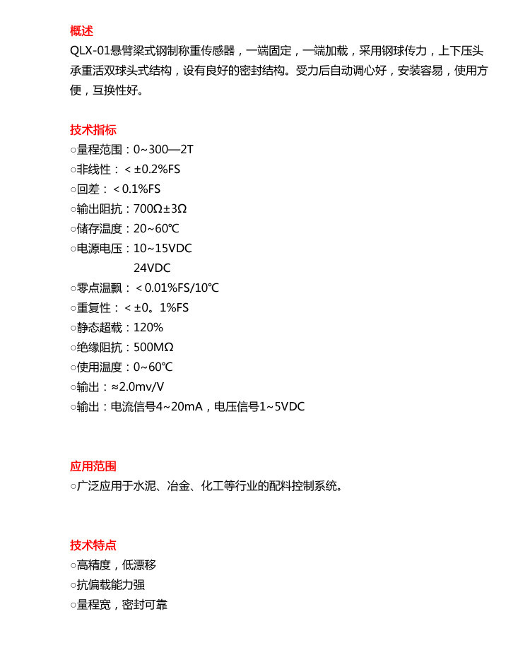 灵敏度 | mV/V | 2.0±0.05 | 灵敏度温度系数 | ≤%F·S/10℃ | ±0.03 |