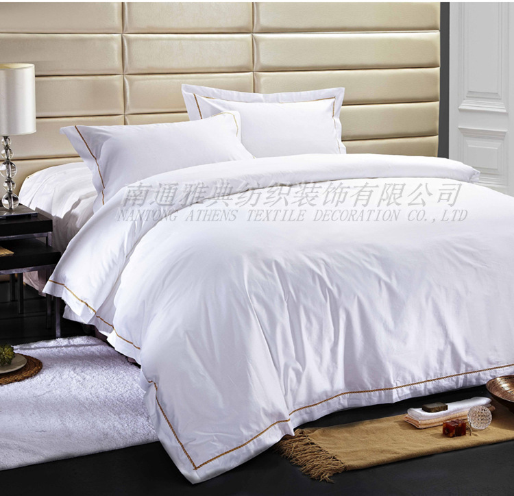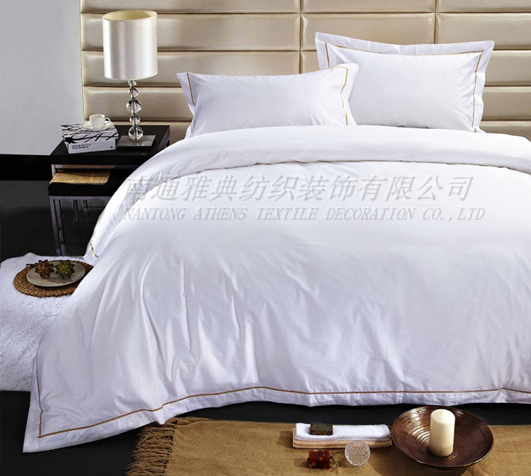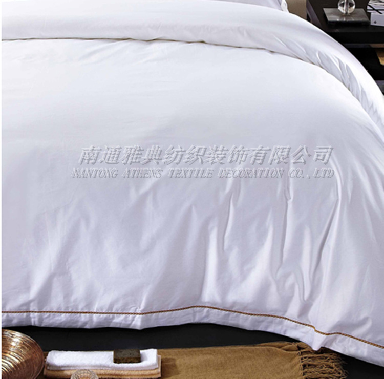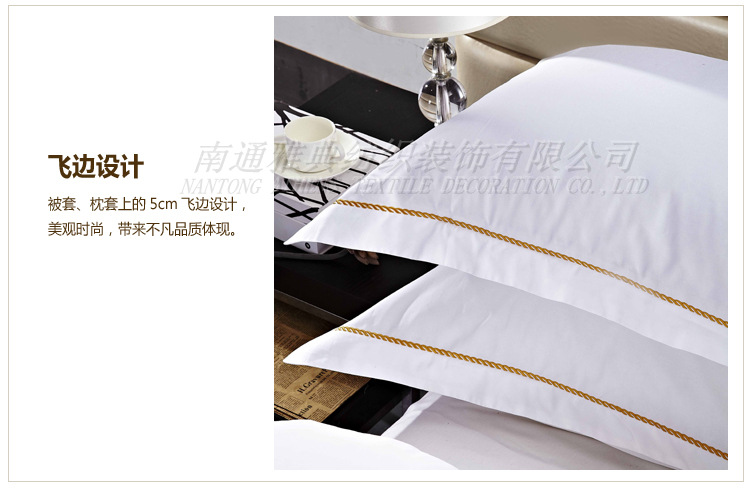 贡缎被套,电脑绣小鱼边,采用丝光贡缎面料,三面绣边,彰显被套档次,提升客房品味。