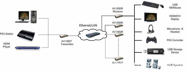 网络型HDMI高清视频延长系统AVI950系列是一个通过TCP / IP的以太网扩展高解析度的HDMI/DVI接口、USB、红外和RS-232接口的完美解决方案。它包含AVI-950T发送器和AVI-950R接收器,AV-950T发送器连接PC机或HDMI / DVI / USB信号源,AV-950R接收器则连接到HDMI / DVI显示器、喇叭、麦克风、USB接口(键盘/鼠标/存储/ ...)或RS232设备,它以标准的千兆或光纤以太网LAN交换式集线器来连接发送器和接收器来传输高清晰度的HDMI /DVI视频和实现KVM延长器的功能,适用于信息显示终端机、娱乐场所、会议室、法庭、医疗、军事和教育的数字式信息显示系统。