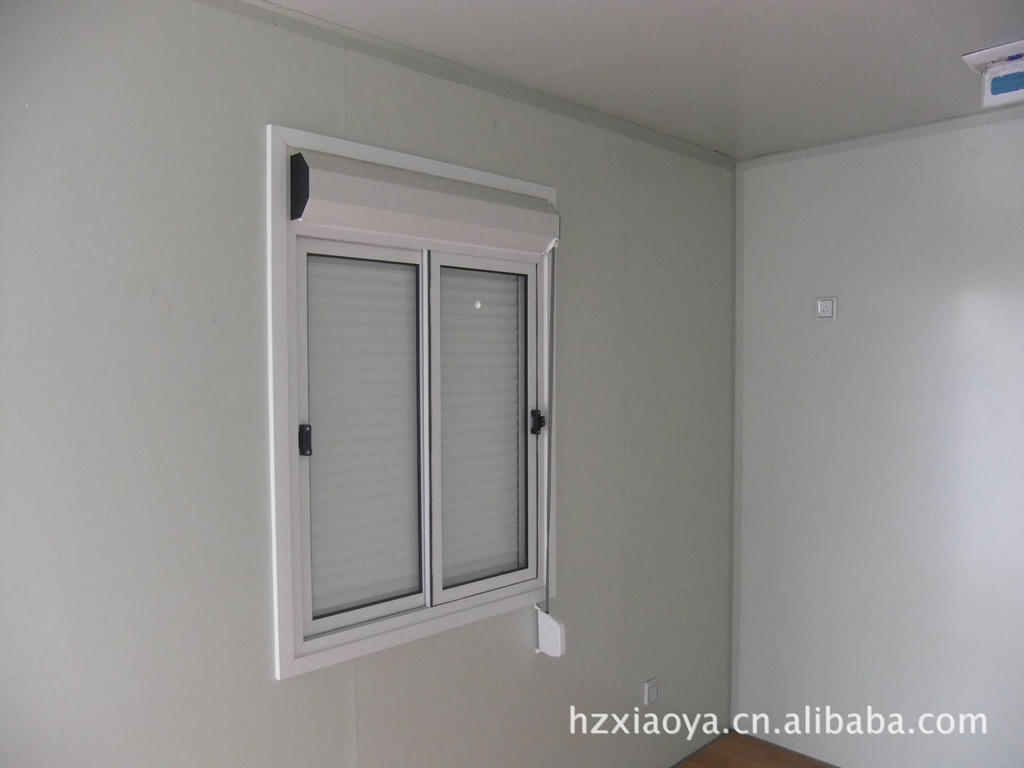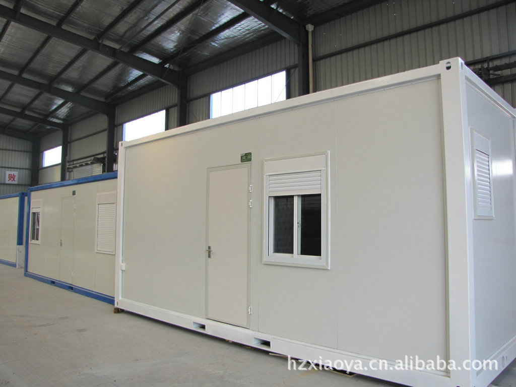 标准集装箱单箱规格,便于运输、吊装;可根据需要任意组合,大小随意,建筑迅速,可重复拆装使用,非常方便。 小板组合式结构设计,焊接钢结构框架。设叉车孔/电源进线装置/排气扇/标准门窗。 壁板为彩钢聚苯乙烯夹心板,表面平整光洁,具良好的耐酸、碱、盐雾等腐蚀性,整体防水、隔音、保温、易清洁、易维护。 单箱规格:(20英尺标准) 外尺寸(L/W/H):6058*2438*2591mm外观照片