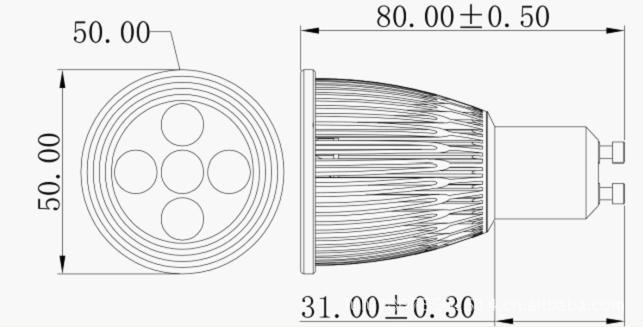 5*1瓦大功率射灯采用高亮度LED,光通量为400lm左右。外壳为散热铝材,表面哑银阳极氧化,面罩为玻璃。底座为GU10,也可以做成E27、E14、MR16底座。外型尺寸为Φ50×80mm。输入电压为AC85-265V。