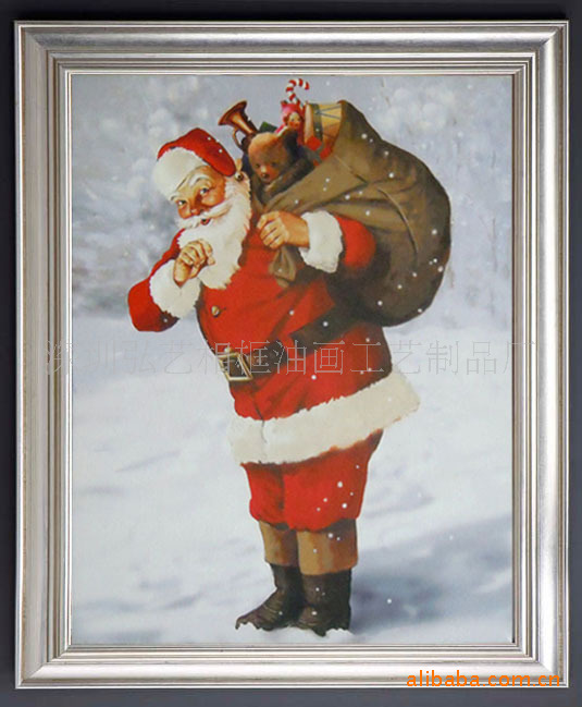 现有一批出口瑞典的外贸尾货,圣诞老人油画,纯棉油画布高精度喷绘,带内框与背后五金配件、纯棉挂绳,品质优良,价格低,外框可选装,数量有限,预购从速!