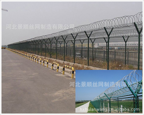 机场护栏网又称作“Y型安全防御护网”,是由V型支架立柱,加强型焊接片网,安全防盗连接件和热镀锌刀片刺网组成强度和安全防御性级别很高。近年来,被广泛应用在机场,军事基地等高安全场所。