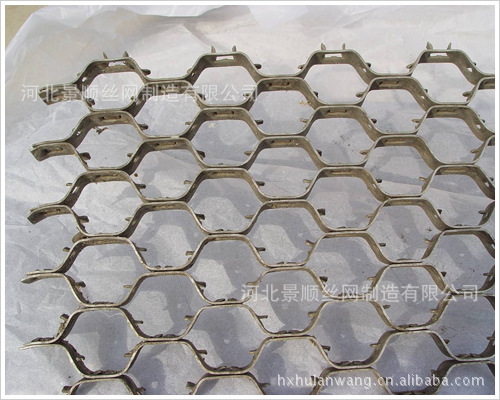 网片大小,由购方自定各种规格加工定做,已有多家主机厂配套合作生产各种金属配件、已为多家石化设备制造企业配套供应各种衬里金属结构件,所生产的产品广泛应用于石油化工大型装置,特别是有利于催化剂化装置主要设备的衬里结构的主要配件之一,它能够提高衬里的耐磨性能和强度,耐磨衬里都用龟甲网加固,一般部位用碳钢(A3F)龟甲网、如反应器及一、二级旋风分离器、U型管再生器烟道等处, 高温部位用合金(1Cr13)龟甲网,如再生器及一、二级旋风分离器等处。龟甲网为20*17.5毫米的扁钢带冲成的六角形格,固定在保温钉端板上。