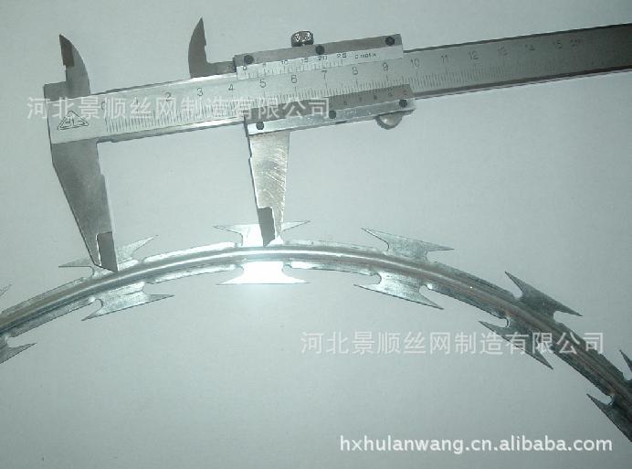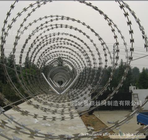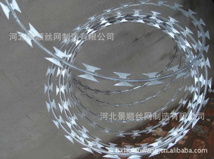 刀片刺网又名蛇腹网或刮刀型刺网,是一种近年来防护、隔离能力较强的新型产品。 刀片用及耐腐蚀性的热镀锌钢板或不锈钢板做材料,由专用机械强力包附与热镀锌高碳钢丝或不锈钢丝做的芯线上。由于有着锋利美观的刀片刺、高强度的芯线,使本产品综合了防阻效果好、难破坏、安装美观方便快捷、耐老化等诸多优点。
