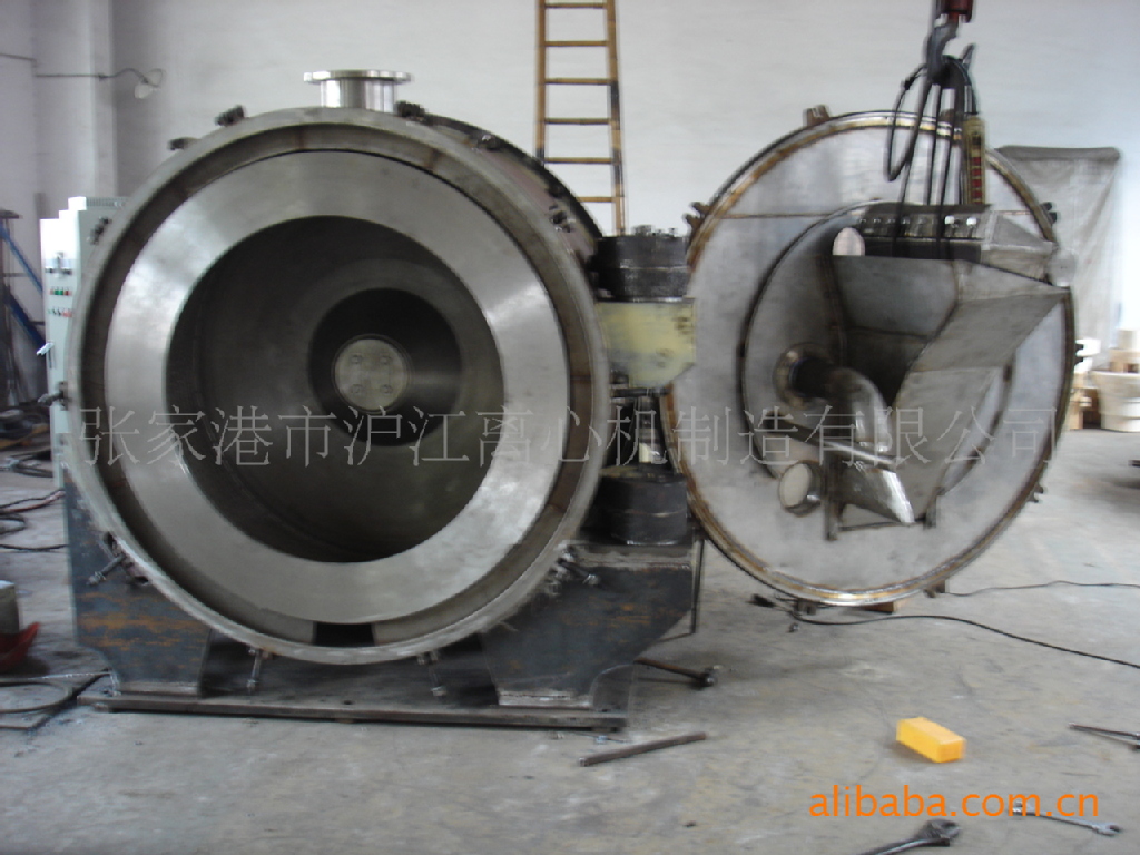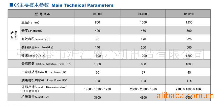 GK型离心机是一种卧式、连续运转、宽刮刀卸料间歇操作的过滤式离心机。电机带动转鼓达到全速运转后,物料由进料管引入转 鼓内,在离心力的作用下,液相物穿过滤布和转鼓壁滤孔排出转鼓,经排液管排出机外。经初滤、洗涤、精港督滤后刮刀旋切卸料。刮下的固相物料经出料斗由重力 排出机外或采用螺旋输送器卸料。 该机采用液压和电气联合控制,可实现手动、半自动、全自动运行。适用于分离固相颗粒>+0.01mm,含固量大于25%,液相粘度小的悬浮液。机器 分离因数高,因此,分离效果好,获得的固相湿度也较低,能对固相物进行充分有效洗涤,具有较高的生产能力。
