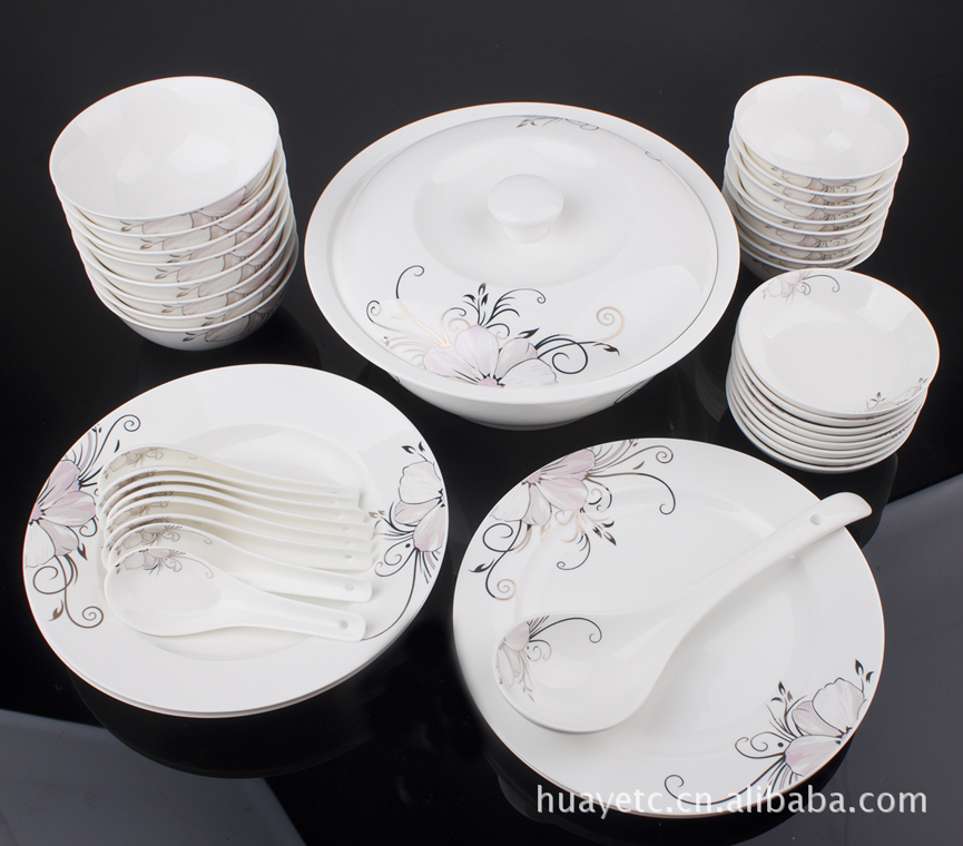 【组件】:8个4.5寸碗 8个3.6寸碗 8个4寸饭碟 8条二针匙 1个9寸汤锅 1条二弯匙 2个8寸平盘 2个8寸汤盘