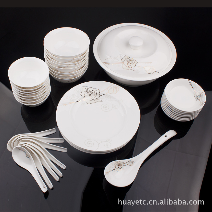 【组件】:8个4.5寸碗 8个3.6寸碗 8个4寸饭碟 8条二针匙 1个9寸汤锅 1条二弯匙 2个8寸平盘 2个8寸汤盘