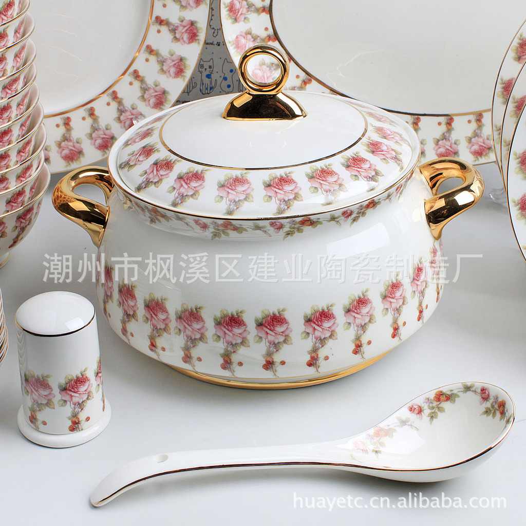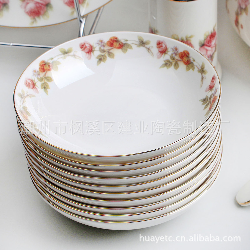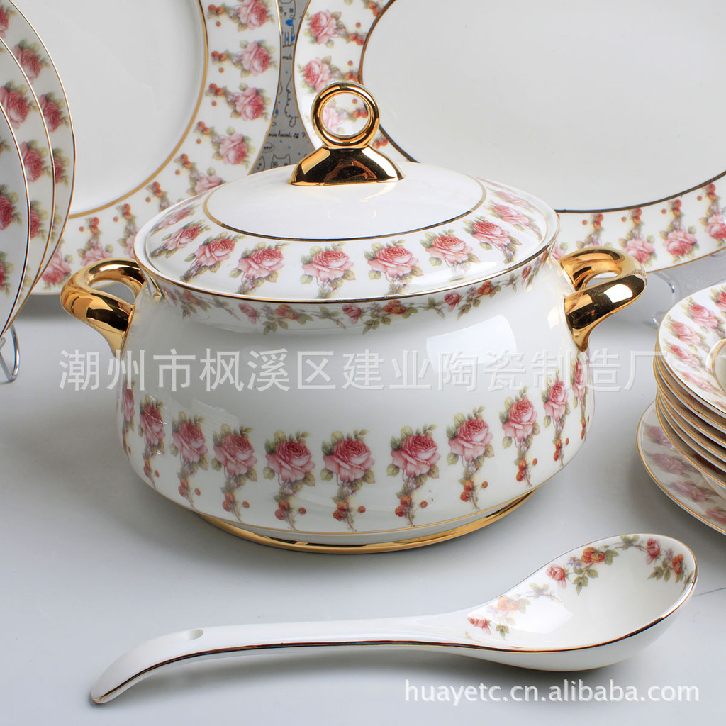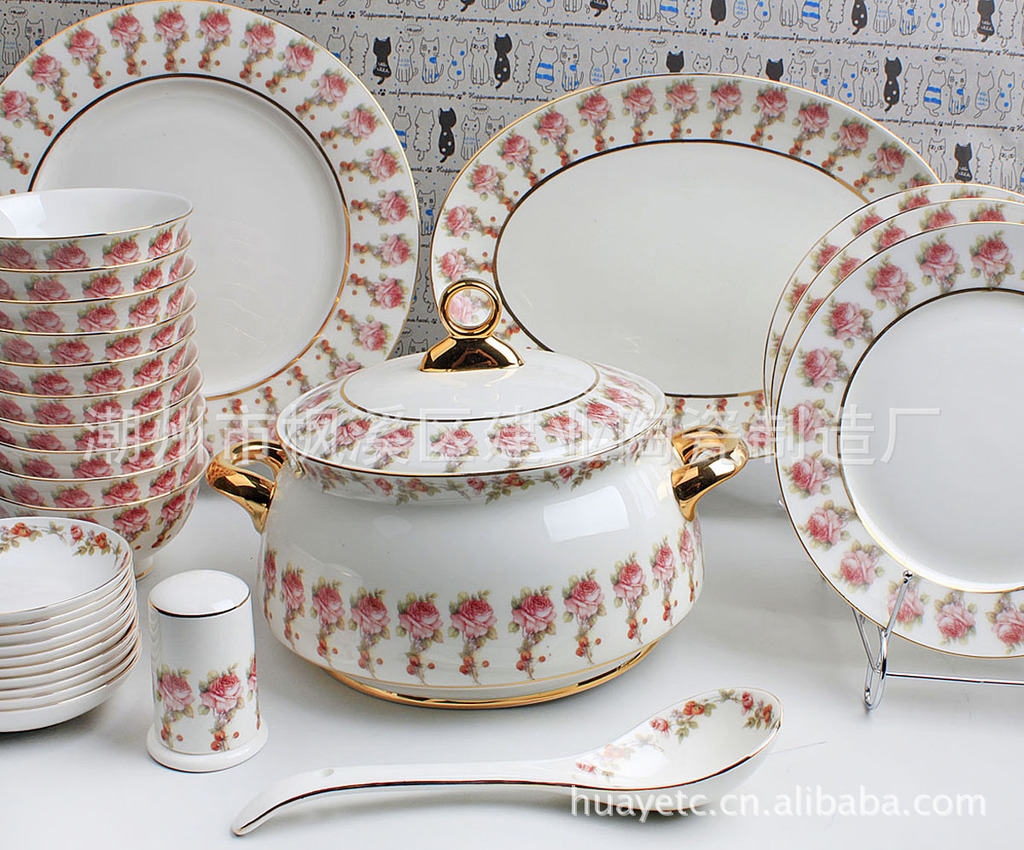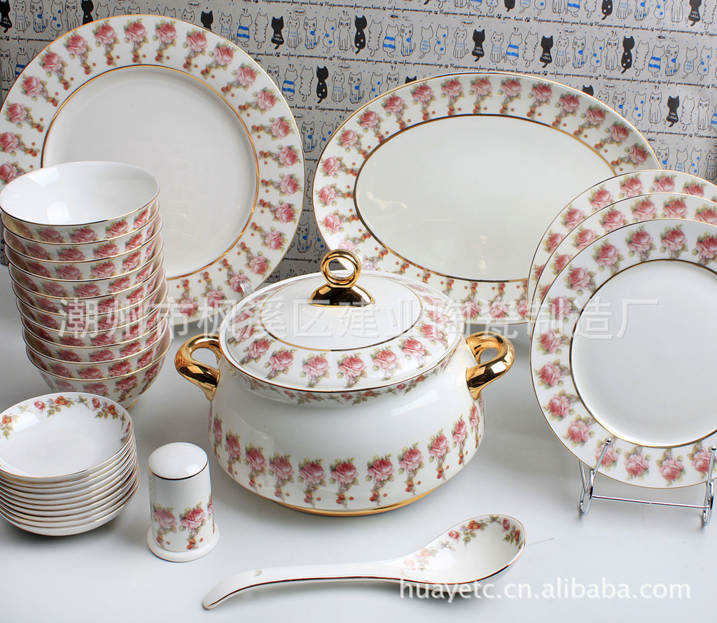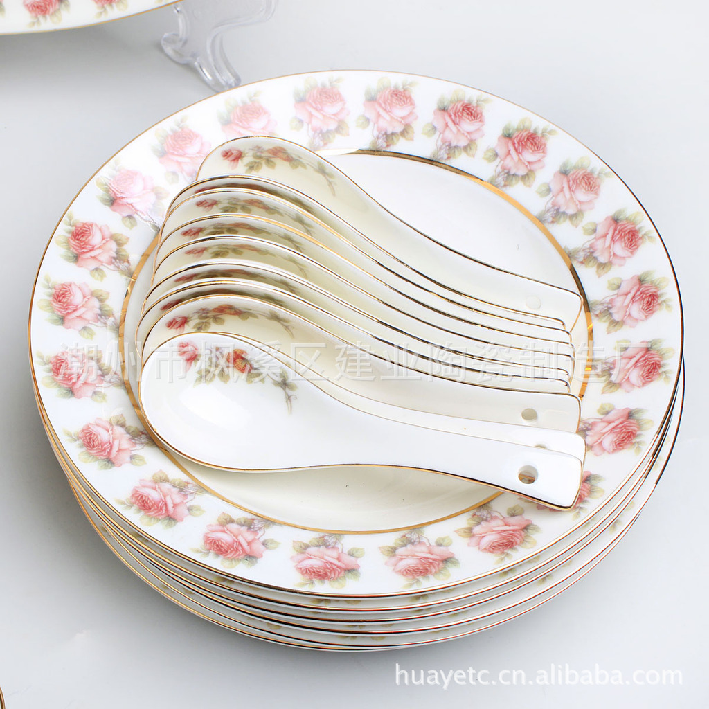 4.5寸碗×10 8寸平盘×4 8寸汤盘×6 4寸饭碟×10 二针匙×10 筷架×10 10寸"平盘×1 12寸鱼盘×1 9寸汤锅×1 二弯匙×1 牙签筒×1 烟碟×1