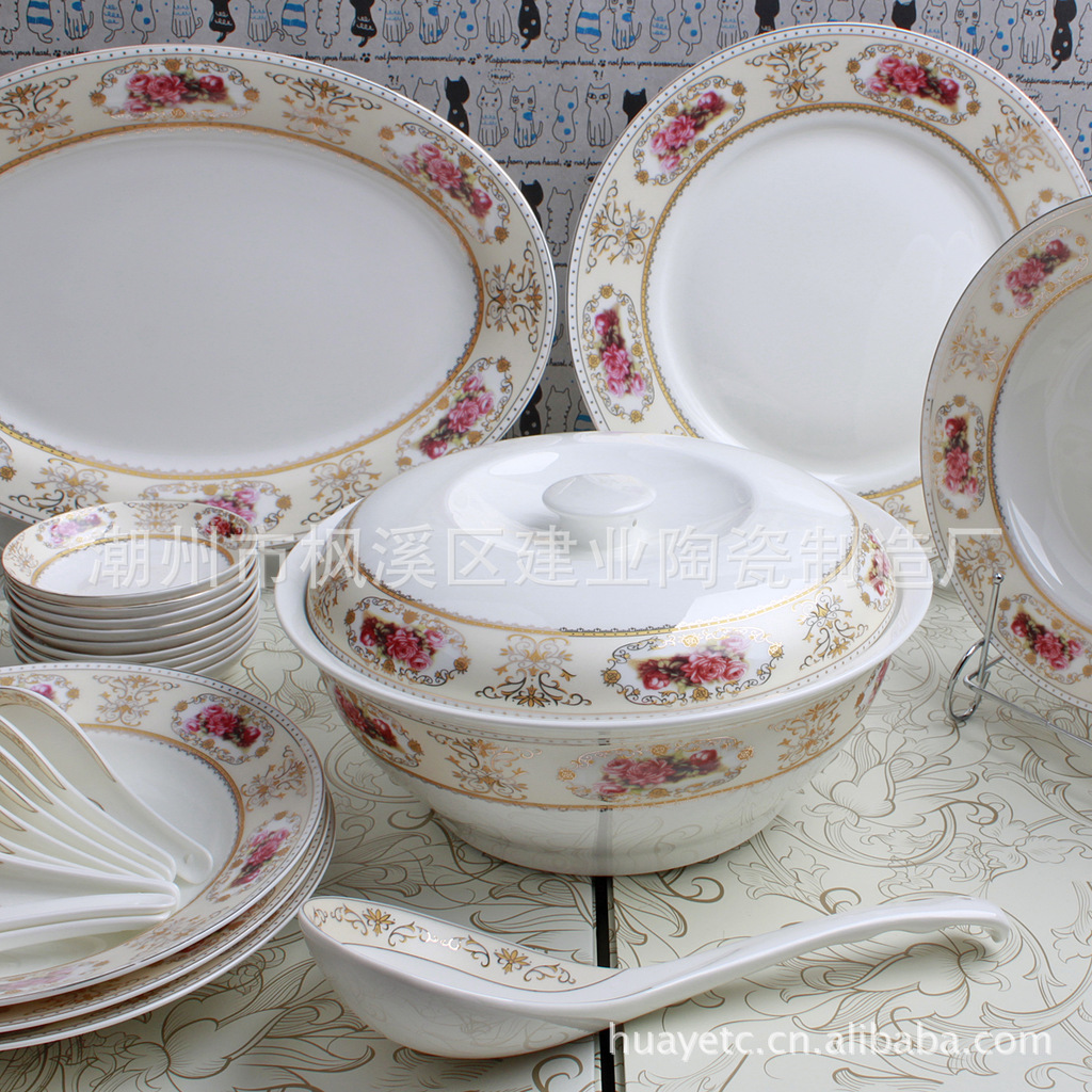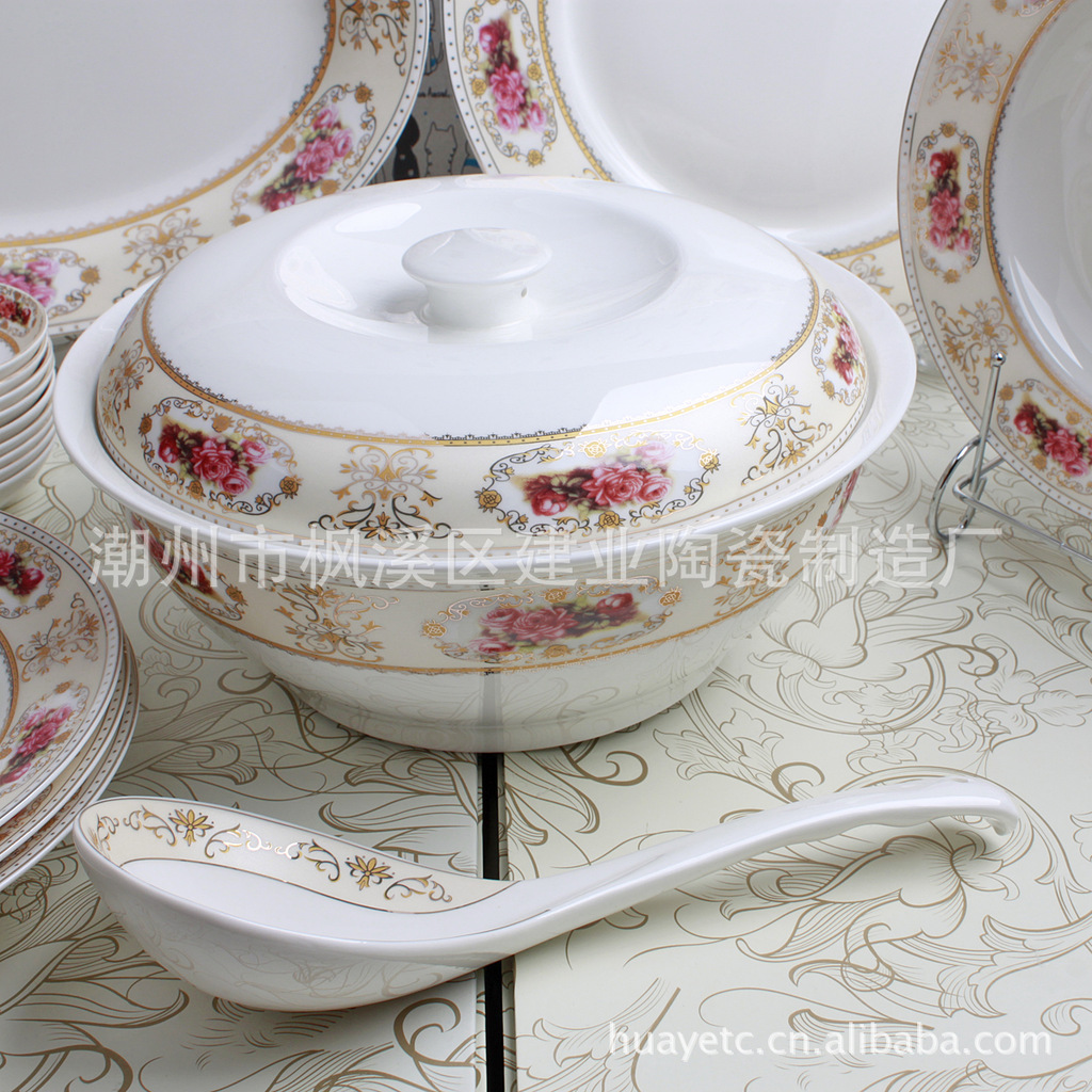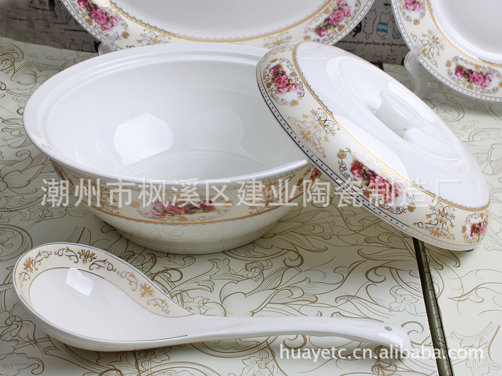 4.5寸碗×10 8寸平盘×4 8寸汤盘×6 4寸饭碟×10 二针匙×10 筷架×10 10寸"平盘×1 12寸鱼盘×1 9寸汤锅×1 二弯匙×1 牙签筒×1 烟碟×1
