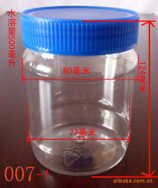 007-1: pet塑料瓶。 水溶量500g,材料pet. 瓶身直径80mm,瓶连盖高123mm,瓶内口径65mm,瓶连盖重43g. 适合装低温液体及固体包装.