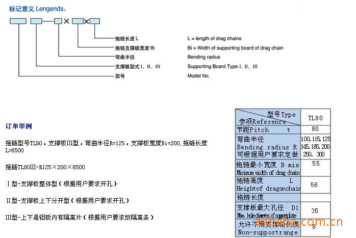 拖链外形似坦克链,由众多单元链节组成,链节之间转动自如。相同系列的拖链内高、外高、节距相同,拖链内高、弯曲半径R可有不同的选择。单元链节由左右链板和上下盖板组成,拖链每节都能打开,装拆方便,不必穿线,打开盖板后即可把电缆、油管、气管等放入拖链内。