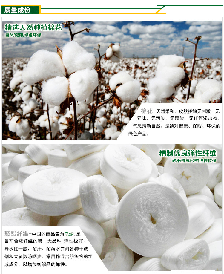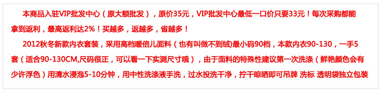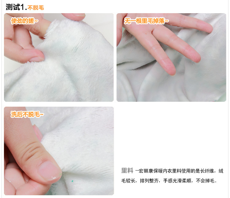 【四】:面料,表层统一采用94.3%精梳纯棉5.7%氨纶不变形,里层采用400克不倒绒布料不掉毛,水印图案工艺不掉色.(注意:目前部分小厂生产表层只为60%纯棉,300-360克薄型布料,图案胶印,价格很便宜的内衣.鉴定重量就是区别.印花柔软度区分)