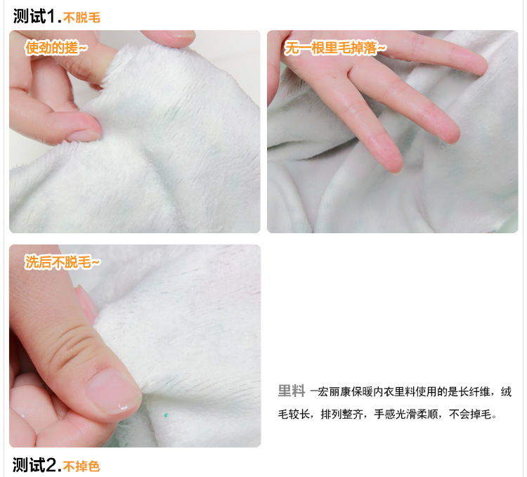 【四】:面料,表层统一采用94.3%精梳纯棉5.7%氨纶不变形,里层采用400克不倒绒布料不掉毛,水印图案工艺不掉色.(注意:目前部分小厂生产表层只为60%纯棉,300-360克薄型布料,图案胶印,价格很便宜的内衣.鉴定重量就是区别.印花柔软度区分)