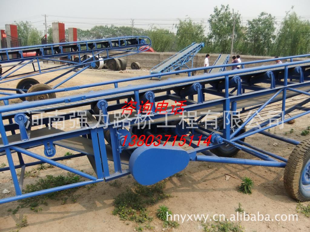 我公司生产的胶带输送机能够经济而有效地输送各种物料。在工业生产中,胶带输送机可用作生产机械设备之间构成连续生产的纽带,以实现生产环节的连续性和自动化,提高生产率和减轻劳动强度。输送带根据摩擦传动原理而运动,具有输送量大、输送距离长、输送平稳,物料与输送带没有相对运动,噪音较小,结构简单、维修方便、能量消耗少、部件标准化等优点,因而广泛应用于采矿、冶金、化工、铸造、建材等行业的输送和生产流水线以及水电站建设工地和港口等生产部门,用来输送松散物料或成件物品,根据输送工艺要求,可以单台输送,也可多台胶带输送机组成或与其他输送设备组成水平或倾斜的输送系统,以满足不同布置形式的作业线需要。胶带输送机可在环境温度-20℃至+40℃范围内使用,输送物料的温度在50℃以下. 胶带输送机主要由机架、输送皮带、皮带辊筒、张紧装置、传动装置等组成。机身采用优质钢板连接而成 ,由前后支腿的高低差形成机架,平面呈一定角度倾斜。机架上装有皮带辊筒、托辊等,用于带动和支承输送皮带。有减速电机驱动和电动滚筒驱动两种方式。