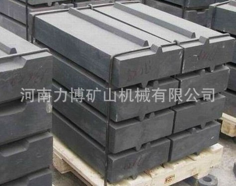 我厂生产的有高锰钢鄂板、衬板、反击块、隔仓板等配件,主要材料有Mn13、Mn13Cr2,还可根据客户要求及具体工况生产硅锰合金、低铬系列、高铬系列、耐磨钢系列衬板。