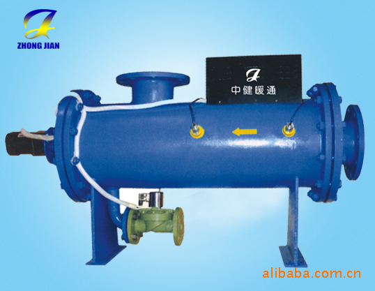 由综合水处理器的壳体、过滤器、高频发生器(详见综合水处理器“结构原理”部分介绍)和智能控制器、电动蝶阀、电动排污阀等组成。智能控制器分两种:一种是压差控制器,一种是定时控制器,前者根据水处理器进出口压力降产生的压差,达到设定值时发出指令,后者则根据预设的时间发出指令,启动电动蝶阀与电动排污阀进行反冲洗过滤排污。原理与全自动冲洗过滤器工作原理同)因而实现全自动运行全程处理水质的防垢、除垢、杀菌、灭藻、过滤、排污。