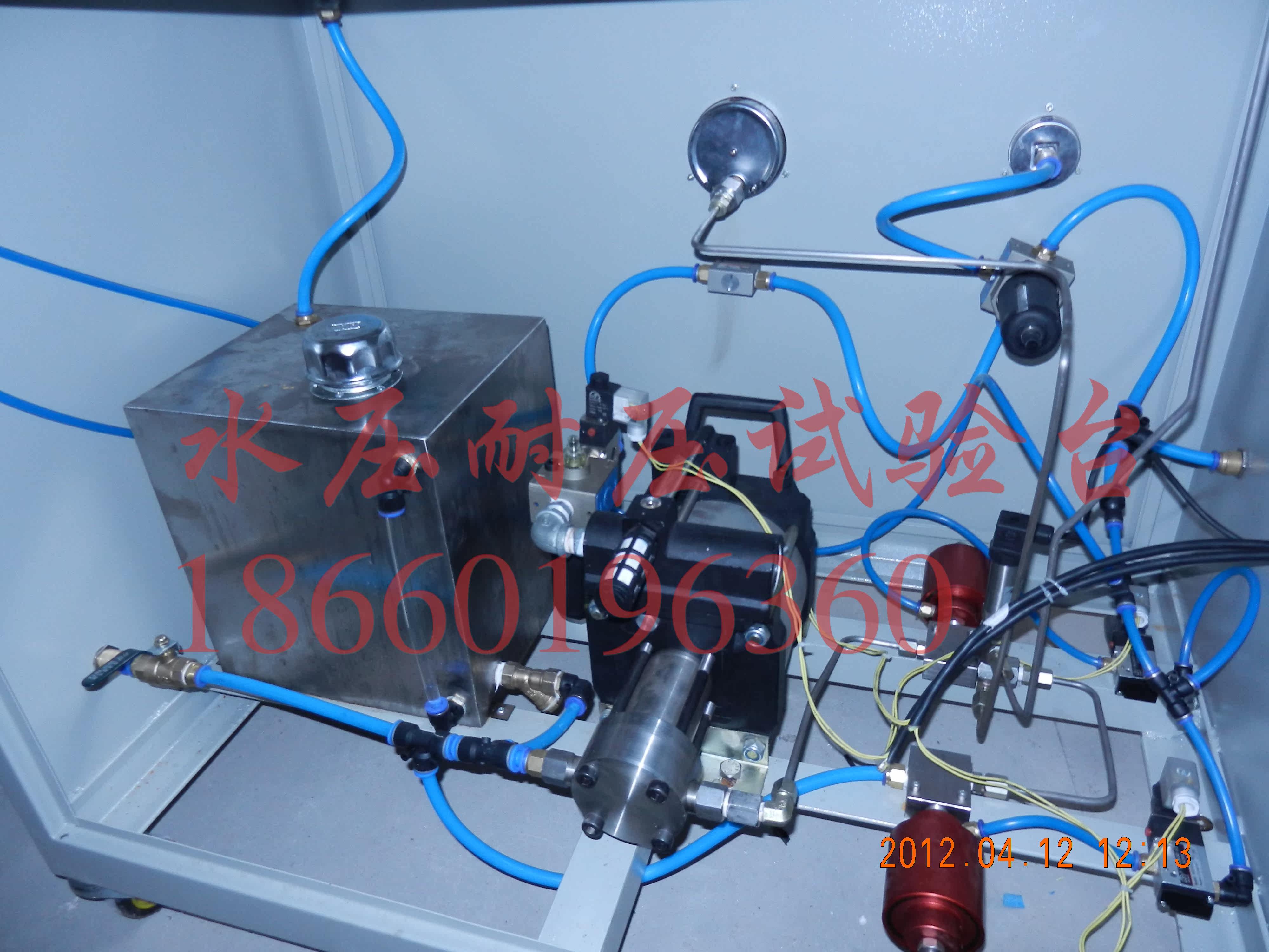 水压耐压试验台它是使用压缩空气为动力源,以气液增压泵为压力源,输出液体压力与驱动气源压成比例。通过对驱动气源压力的调整,便能得到相应的增压后的液体压力。当驱动气源压力与增压后的液体压力平衡时,增压泵便停止充压。因而具有防爆、输出压力可调、体积小、重量轻、操作简单、性能可靠、适用范围广等特点。它特别适用于阀门、管路、连接件、压力容器等受压设备的试压检验。同时也适合科研、检验部门检测工具。