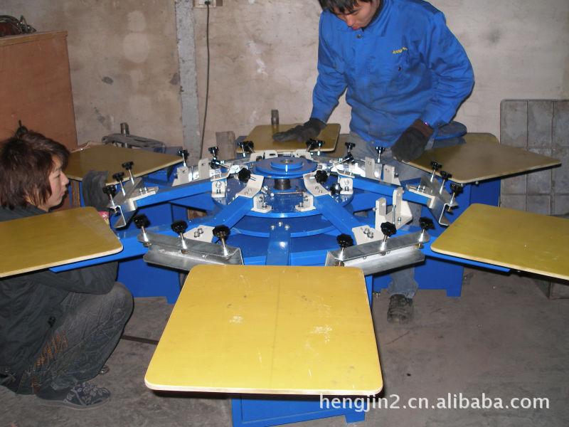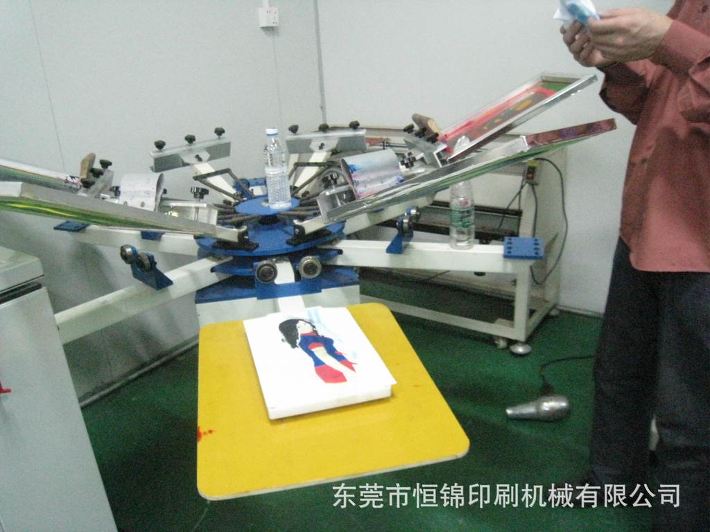 此印花机可印纸、薄膜、服装裁片等,还可印成衣,一机多用,设计精巧、美观,是中小型印花厂理想的设备双层轮转--印台和网板双层轮转,可使四色/六色/八色套印连续运行,且印台转动使热处理过与印花同步进行,提高生产效率和成品率。