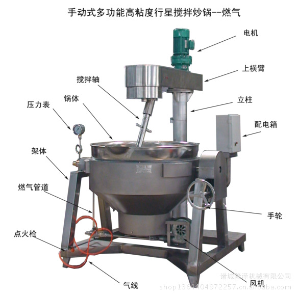 该系列设备主要由锅体、架体、搅拌系统、加热系统、调速传动装置、搅拌轴、锅体翻转系统等组成。 行星搅拌夹层锅从类型上分为手动与全自动。 从加热形式上分为:蒸汽式、燃气式、燃气导热油和电加热导热油。 (注:燃气导热油比较其他产品销售量较少)