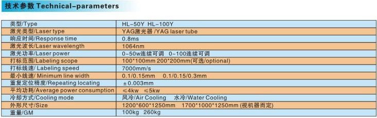 类型/Type | HL-50Y2 HL-100Y | 激光类型/Laser type | CO2激光器/hermetic ang detached co2 laser tube | 响应时间/Response time | 0.8ms | 激光波长/Laser wavelength | 10640nm | 激光功率/Laser power | 0~50w连续可调 0~100连续可调 | 打标范围/Labeling scope | 100*100mm 200*200mm(可选/optional) | 打标线速/ Labeling speed | 7000mm/s | 最小线速/ Minimum line width | 0.1/0.15mm 0.1/0.15/0.3mm | 重复定位精度/Repeating locating | ±0.003mm | 平均功耗/Averaqe power consumption | ≤30kw ≤50kw ≤100kw | 冷却方式/Cooling mode | 风冷/Air Cooling 水冷/Water Cooling | 外形尺寸/Size | 1200*600*1250mm 1700*1000*1250mm | 重量/GM | 100kg 260kg |