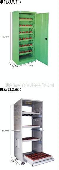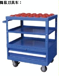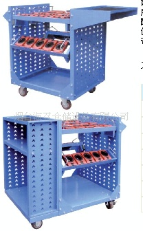 简易型、多用途的刀具车,顶部可存放刀具,中部可放置工具及零部件等物品,底部带锁抽屉柜可存放重要的刀具配件和工具等,配有把手和脚轮,便于移动。前、后、左及顶四周可放置各种刀具座。所有侧板带有人字孔,可选择倾斜角度(0°、15°、30°)放置刀具座。配有防滑胶垫的二层置物板,可放置刀具和其他物品。侧板带有文件夹板,可存放图纸文件。带推车把手和脚轮,方便移动和运送工具。带门工具车:加装外侧板、后板、门板后形成。刀具座在柜中的摆放角度同样可调。全封闭结构,防尘,适合于刀库的使用和管理。