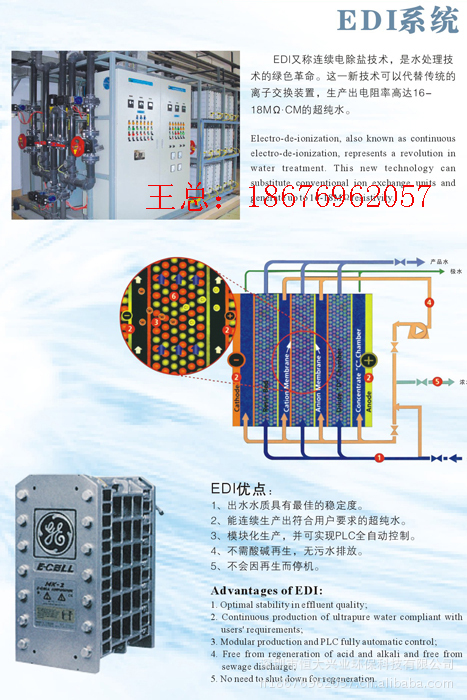 1.无需酸碱再生: 在混床中树脂需要用化学药品酸碱再生, 且需要安全储存酸碱的车间, 再生时有大量有害废水和废弃物需处理, 增加了环保和安全方面的工作困难。 而EDI则消除了这些有害物质的处理和繁重的工作。保护了环境。