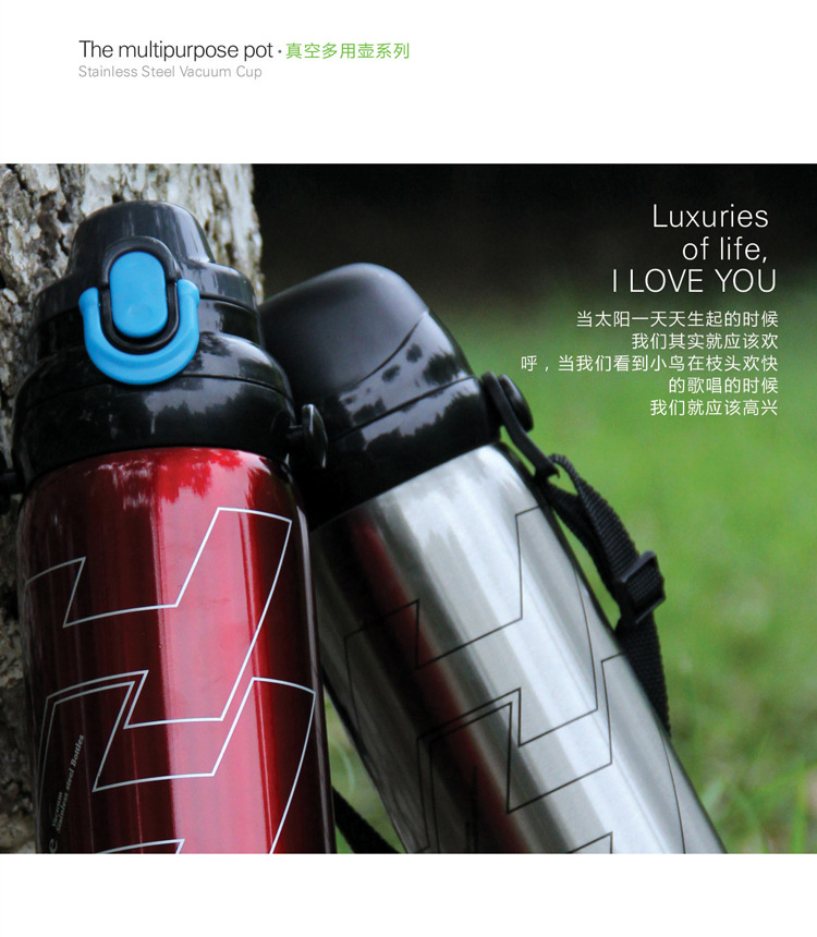 供应800ml 多色选择 一壶双盖 双层不锈钢真空保温保冷广口运动壶