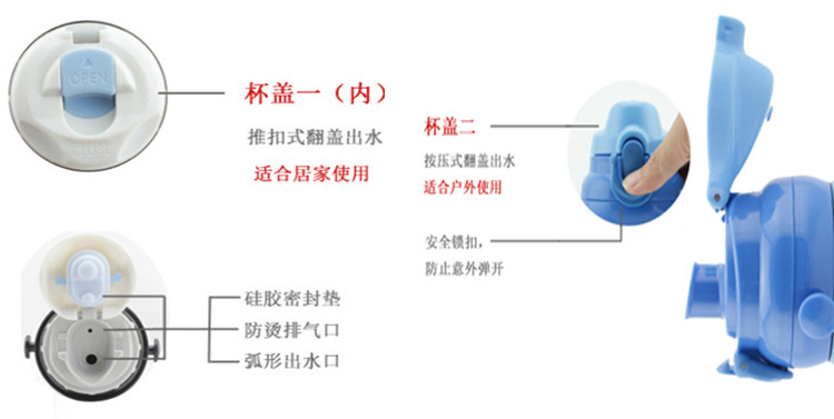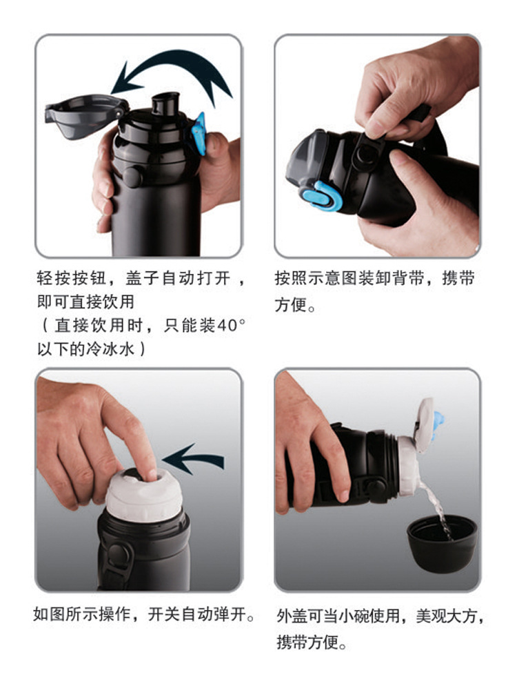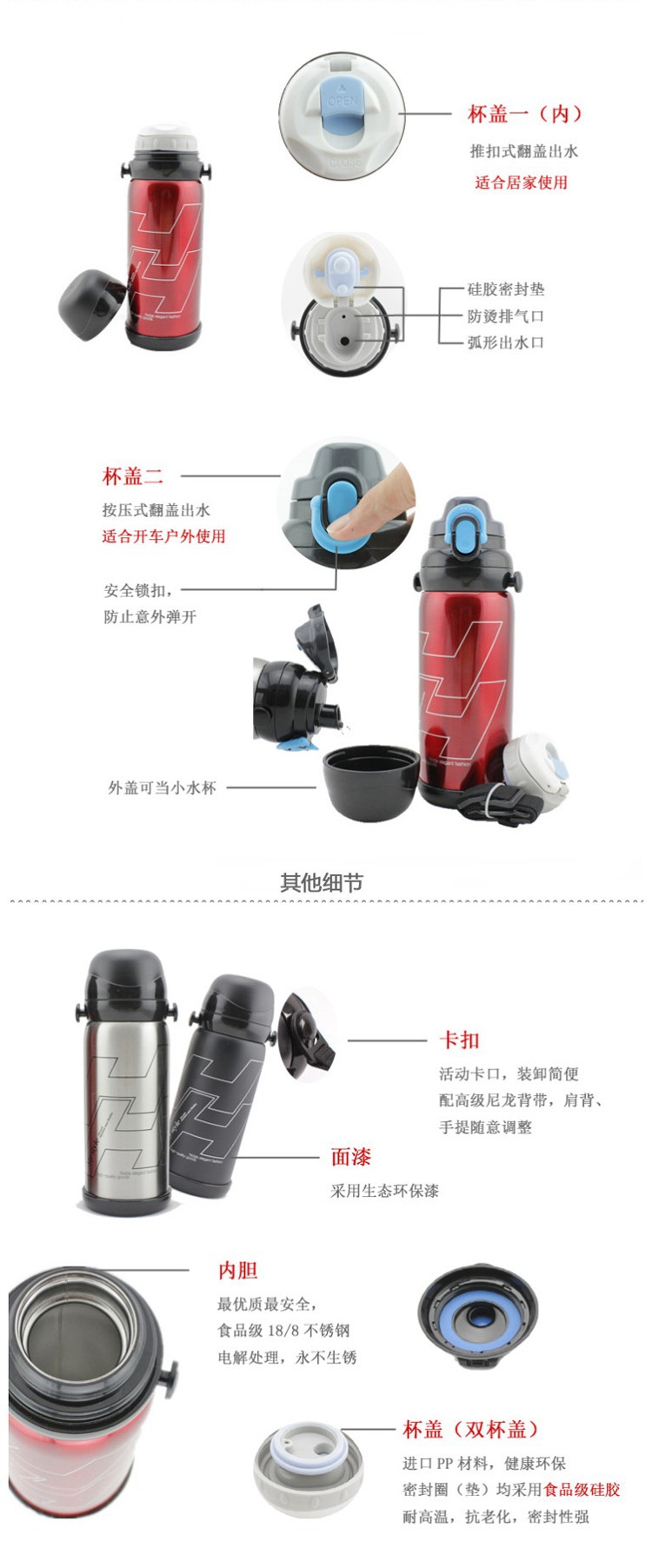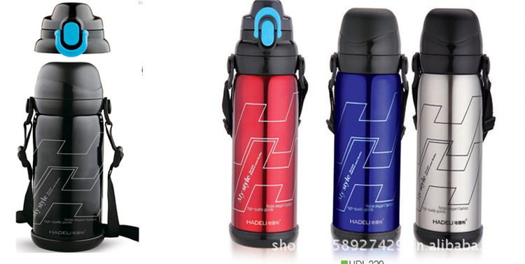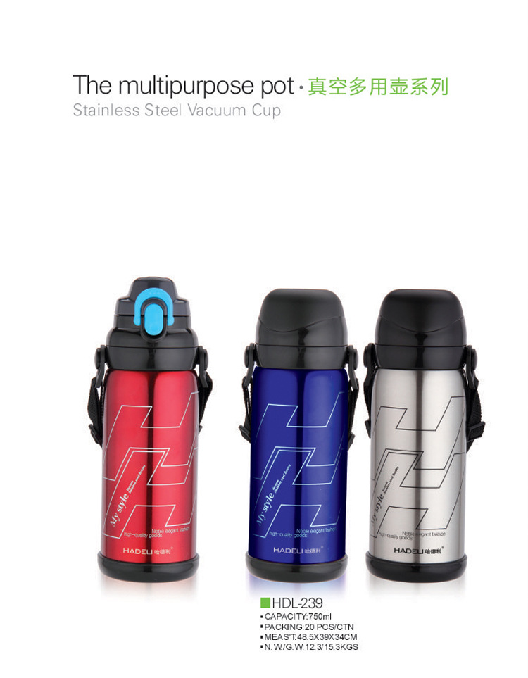 【尺寸】:750ml:高25CM*8CM(测量方法因人而异,仅供参考); 【颜色】:蓝色/红色/黑色/灰色(颜色和LOGO可以根据客户要求量身定做) 【容量】:750毫升 【材质】:304不锈钢.食品级PP塑胶,止水矽胶:食品级高强度矽胶。油漆采用上等亮光不褪色烤漆。 【详细描述】:新品,选用优质304不锈钢材质,中间为运用高科技制成抽真空之断热层,阻绝空气传热,保热保冷效果特优。保温效力12-24小时左右,是你自用馈赠朋友的佳品!24小时可以达到30度 【包装】:彩盒