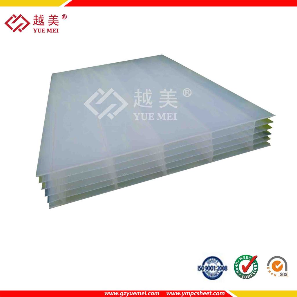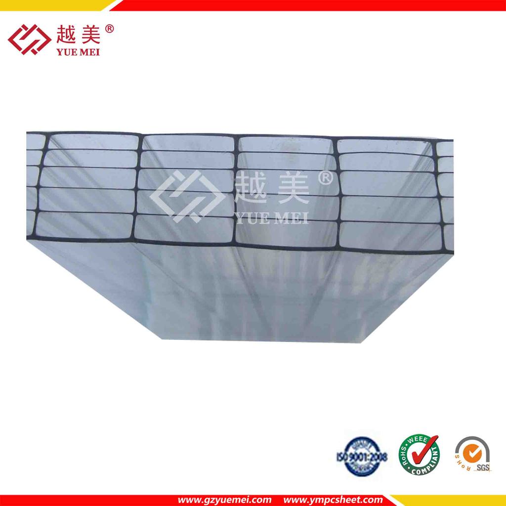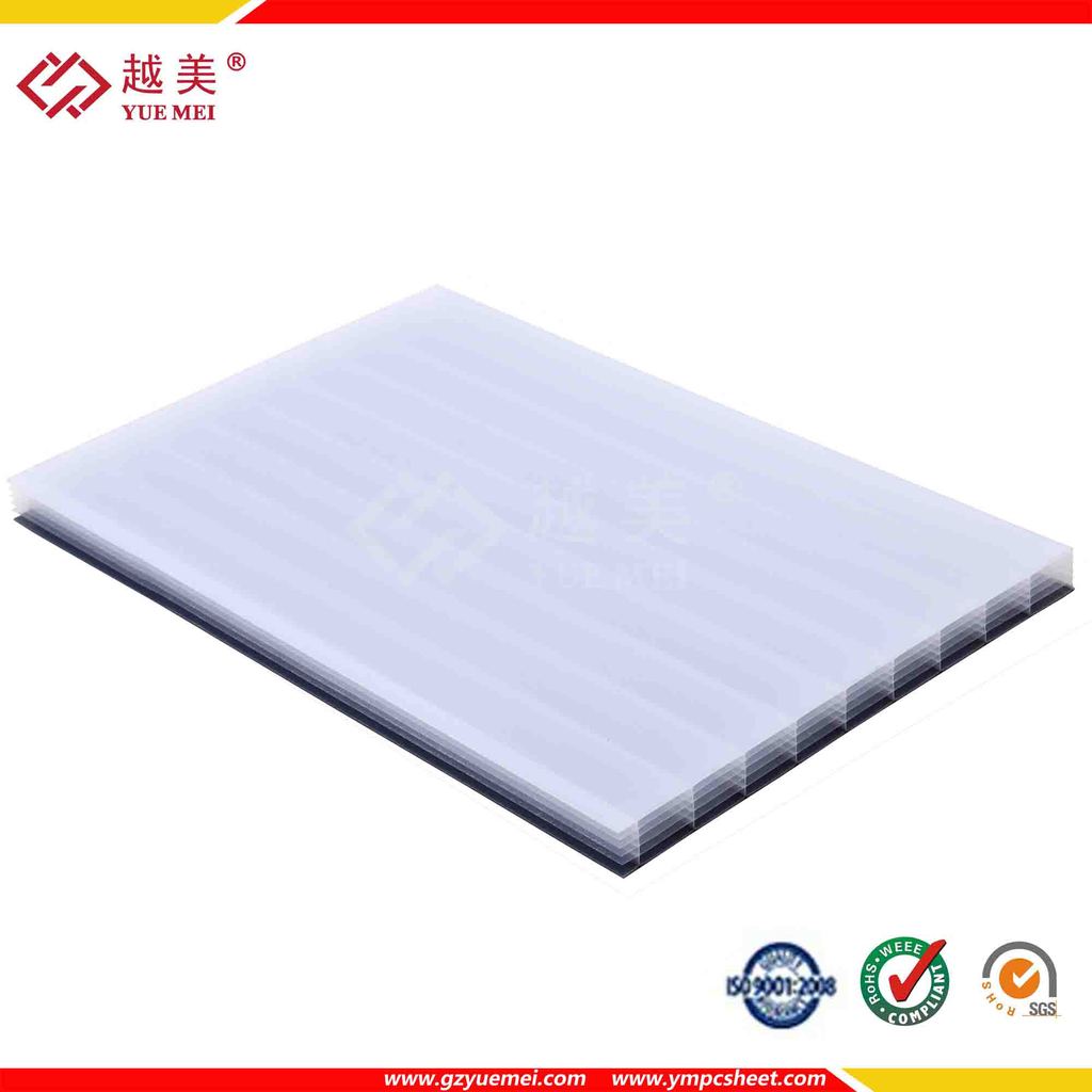越美牌PC六层阳光板,在强度、刚度、室外耐候性、抗冲击性等方面,是双层中空板的4倍或以上,属于高档次的采光材料