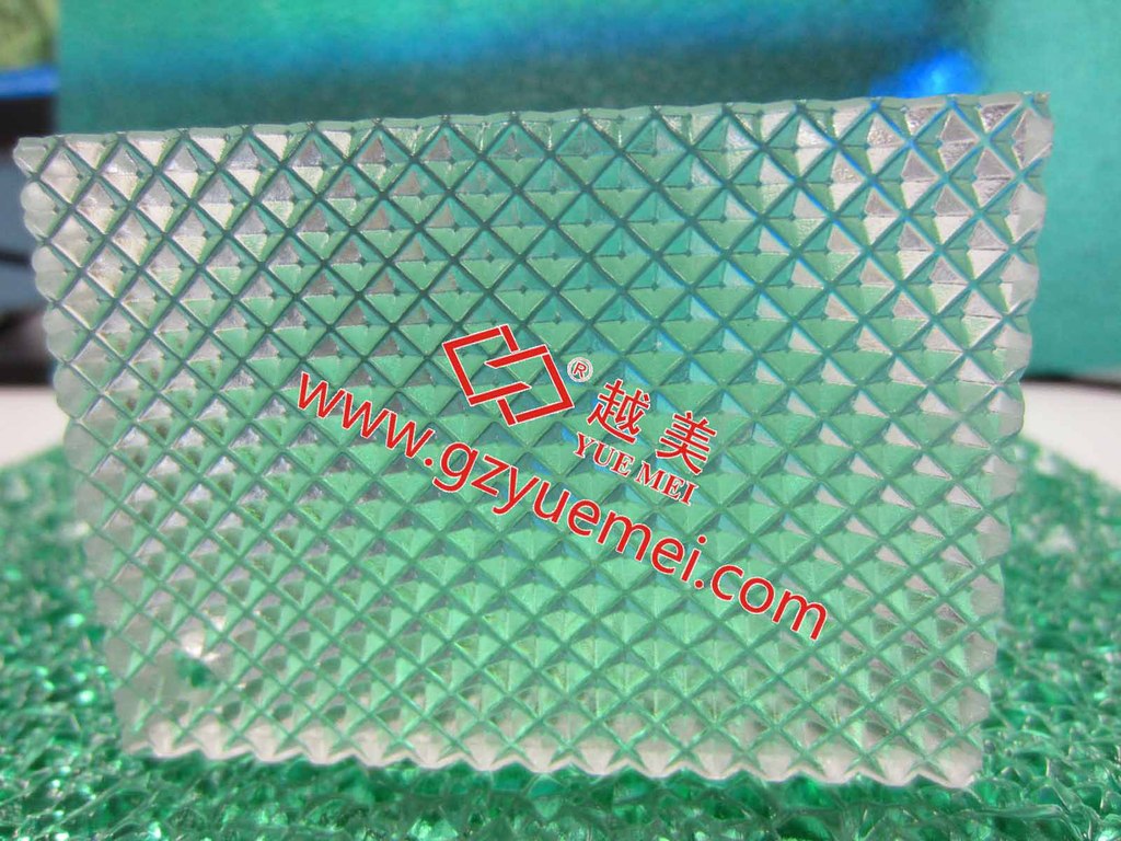 越美PC棱镜纹颗粒板是聚碳酸酯实心板中的一个分支,由于颗粒板外观较为特殊,具有棱镜或者毛玻璃的效果,因此主要用于室内装饰或者隔断及广告行业,机械制造业等用途。同时该类板材同样具有实心板的特性,重量轻,抗冲击强度高,透光率高及颜色多样化。