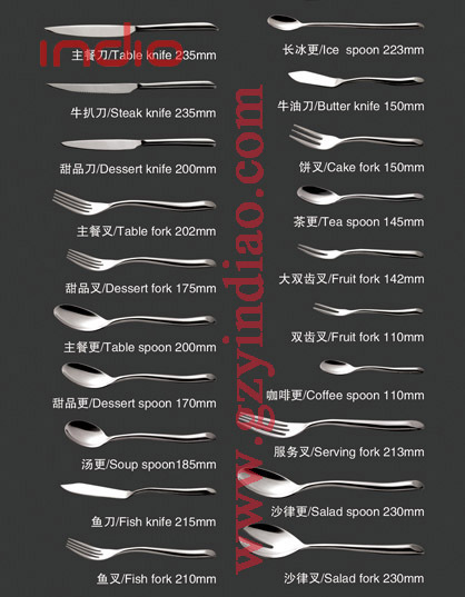 序号图片型号产品名称重量长度CM1 R1455主餐刀97g23.5 2主餐匙92g21.0 3主餐叉74g21.0 4汤匙74g19.0 5二齿果叉37g14.5 6甜品刀65g20.4 7甜品叉62g18.0 8甜品匙74g17.3 9牛扒刀95g24.0 10咖啡匙20g11.5 11二齿蜗牛叉22g11.0 12四齿点心叉42g15.0 13茶匙50g14.5 14三齿饼叉42g15.5 15黄油刀35g15.5 16奶油刀58g14.0 17鱼刀30g21.5 18鱼叉76g21.5 20沙拉更150g24.0 21沙拉叉143g23.5 22服务更95g21.0 23服务叉80.0 21.0 25蛋糕铲120g24.0 26雪糕匙45g13.0