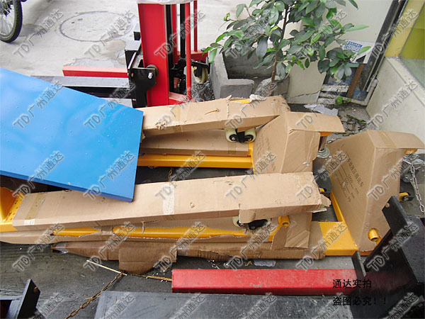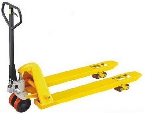 将货叉插入托盘孔内,由人力驱动液压系统来实现托盘(货物)的起升和下降,并由人力拉动完成搬运作业,是托盘运输工具中最简便、最有效、最常见的装卸搬运工具。