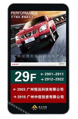 产品简介:楼层指示灯箱是专为全国一、二线城市高档写字楼设计制作,属于写字楼的室内媒体,产品悬挂于每栋写字楼的每一层楼电梯口对面的墙上,超薄灯箱制作,具有瞬间照明功能和楼层、房号指示及公司名称、方向索引功能;是每天每层楼所有办公人员上下班必需路过和看到并记忆的一种新型媒体;超薄灯箱制作,采用新型的设计理念,红外线人体感应开关,当电梯门一开,灯箱遇人即亮;类似楼宇广告机的外形设计,高档美观,特别是广告视窗上的广告画面通过灯箱内的LED发光照射更加逼真动人,引人注目;该媒介适合各类高端品牌投放宣传,同时也是一种覆盖率广告到达率极高的新型媒体;