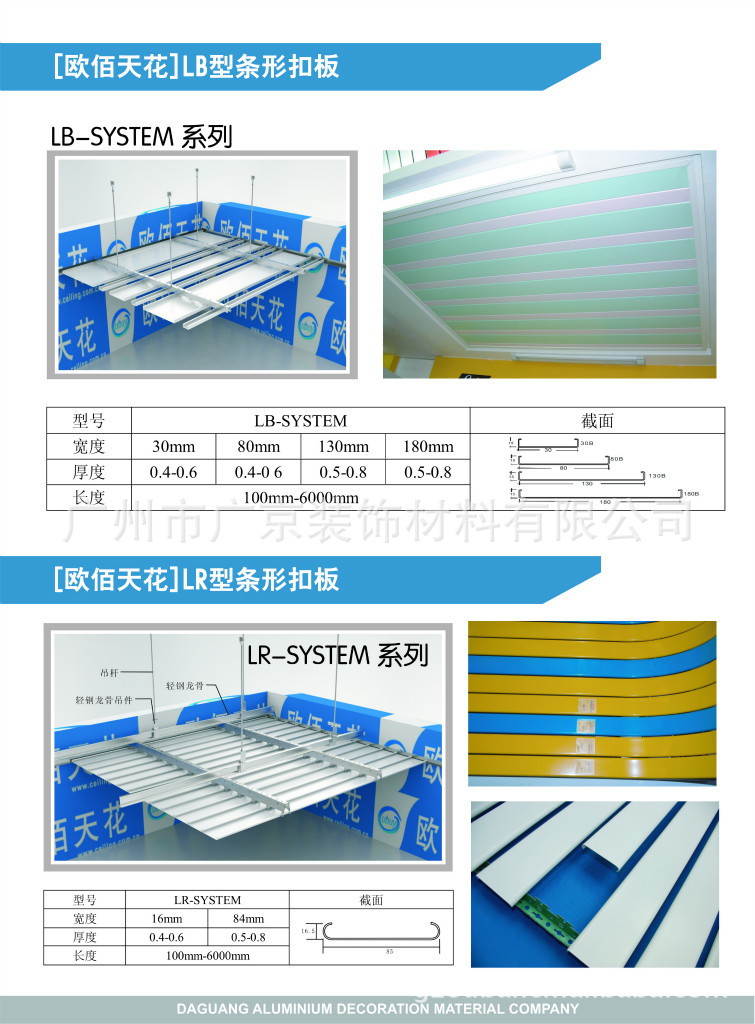 欧佰条形扣板天花吊顶系统由装饰面板、条形扣板专用副龙骨以及上层轻钢主龙骨和相关配件共同构成。
